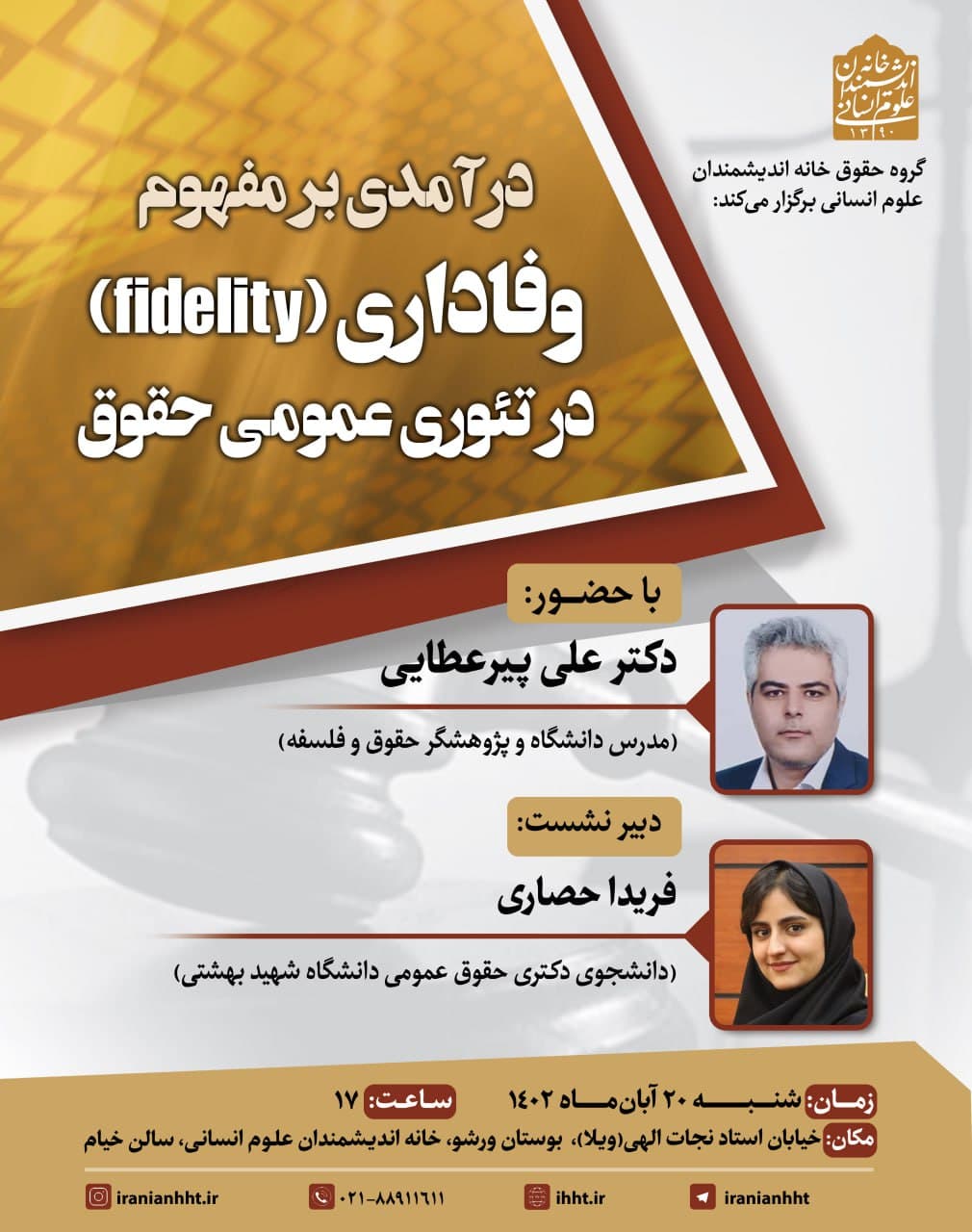 نشست "درآمدی بر مفهوم وفاداری در تئوری عمومی حقوق" روز شنبه ۲۰ آبان در سالن خیام خانه اندیشمندان علوم انسانی برگزار می شود.