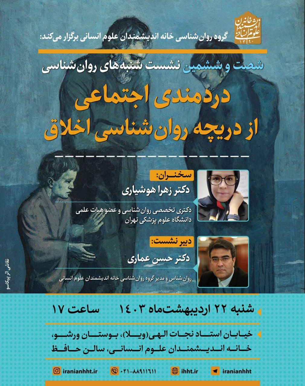 نشست "دردمندی اجتماعی از دریچه روان شناسی اخلاق" روز شنبه ۲۲ اردیبهشت در سالن حافظ خانه اندیشمندان علوم انسانی برگزار می شود.