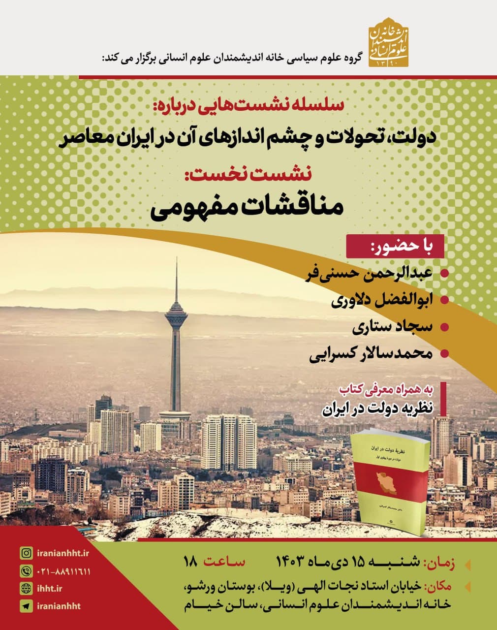 نشست "دولت، تحولات و چشم اندازهای آن در ایران معاصر" روز شنبه 15 دی در سالن خیام خانه اندیشمندان علوم انسانی برگزار می شود.