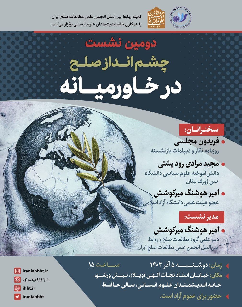 نشست دوم "چشم انداز صلح در خاورمیانه " روز دوشنبه 5 آذر در سالن حافظ خانه اندیشمندان علوم انسانی برگزار می شود.