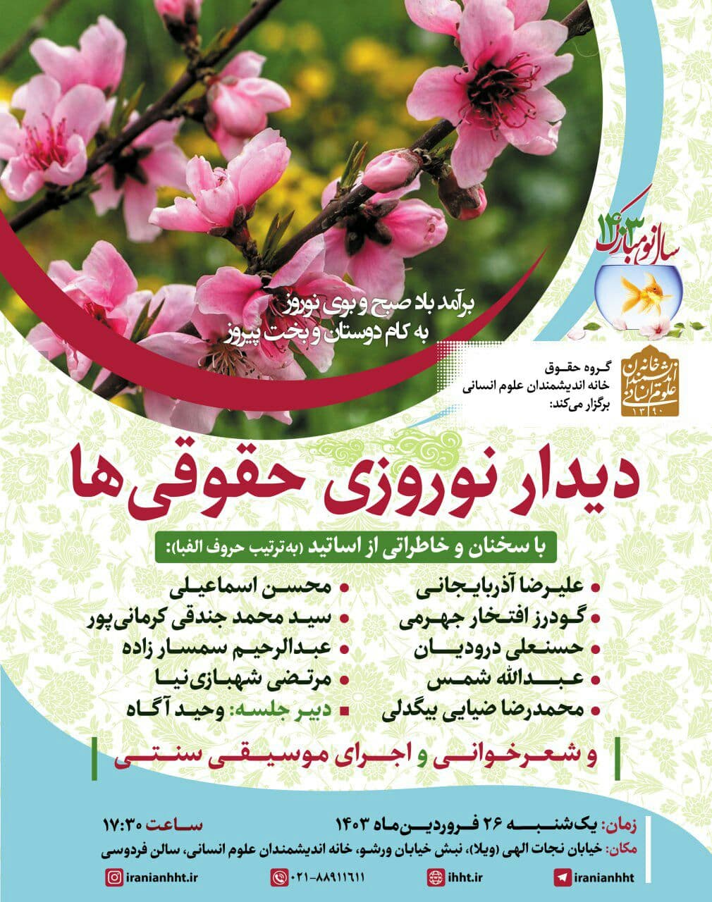 نشست "دیدار نوروزی حقوقی ها" روز یکشنبه ۲۶ فروردین در سالن فردوسی خانه اندیشمندان علوم انسانی برگزار می شود.