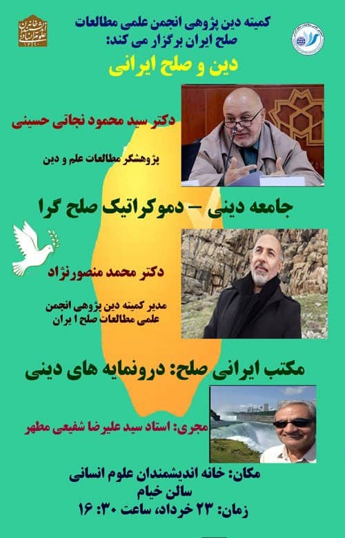 نشست "دین و صلح ایرانی" روز چهارشنبه 23 خرداد در سالن خیام خانه اندیشمندان علوم انسانی برگزار می شود.