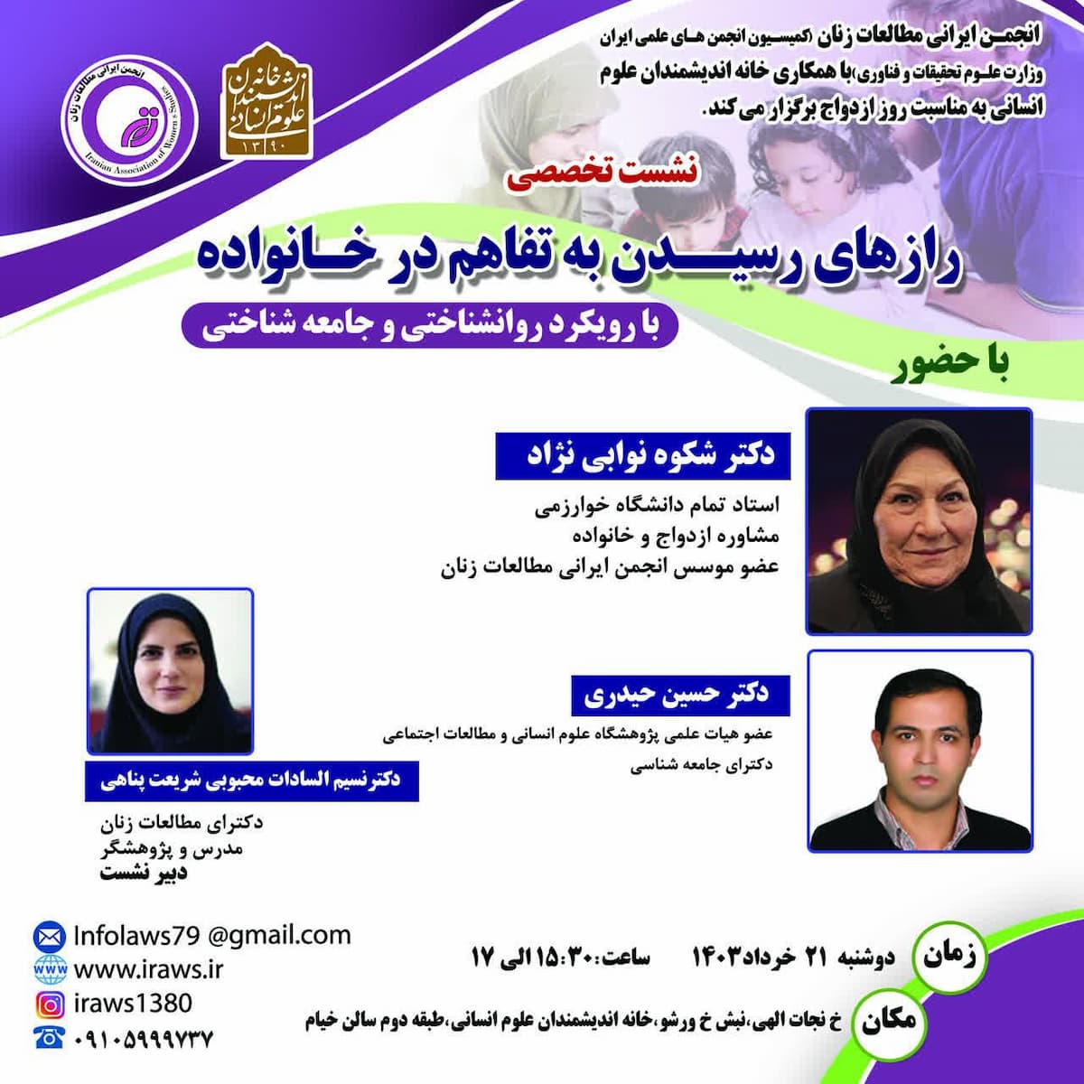 به گزارش روابط عمومی خانه اندیشمندان علوم انسانی، نشست "رازهای رسیدن به تفاهم در خانواده" به همت انجمن ایرانی مطالعات زنان و با همکاری خانه اندیشمندان علوم انسانی، روز دوشنبه 21 خرداد 1403 ساعت 15:30 در سالن خیام خانه اندیشمندان علوم انسانی برگزار می شود.