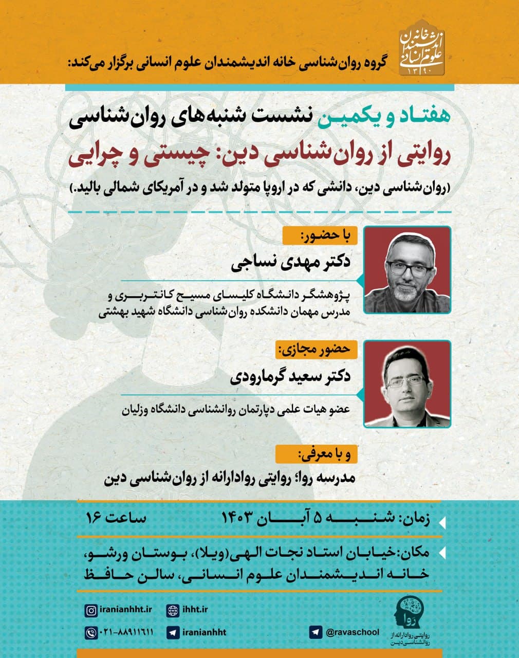 نشست "روایتی از روان شناسی دین: چیستی و چرایی" روز شنبه 5 آبان در سالن حافظ خانه اندیشمندان علوم انسانی برگزار می شود.