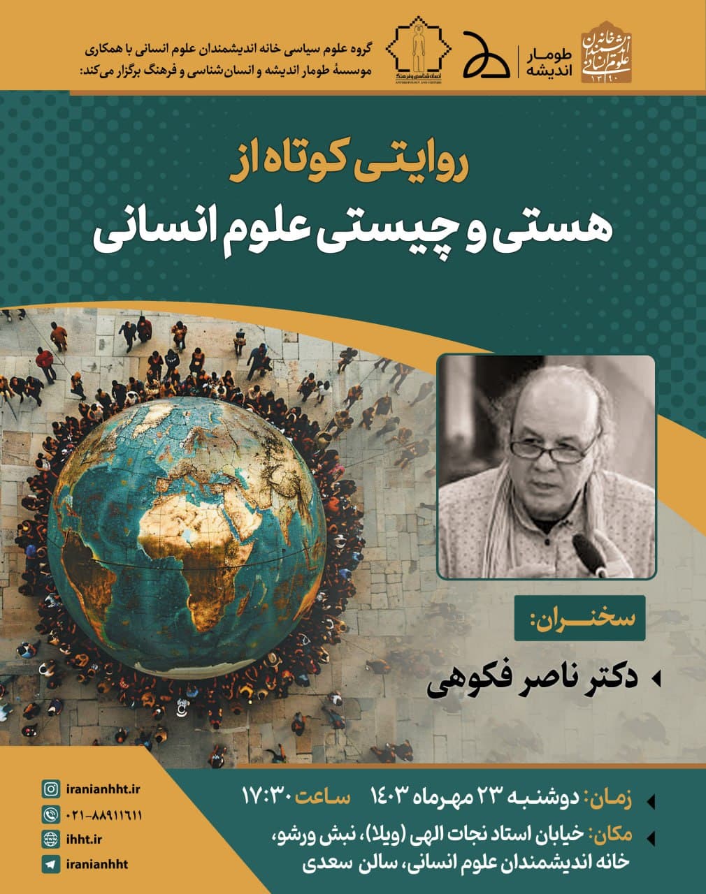به گزارش روابط عمومی خانه اندیشمندان علوم انسانی، نشست "روایتی کوتاه از هستی و چیستی علوم انسانی" به همت گروه علوم سیاسی خانه اندیشمندان علوم انسانی و با همکاری موسسه طومار اندیشه و انسان شناسی و فرهنگ، روز دوشنبه 23 مهر 1403 در سالن سعدی خانه اندیشمندان علوم انسانی برگزار می شود.
