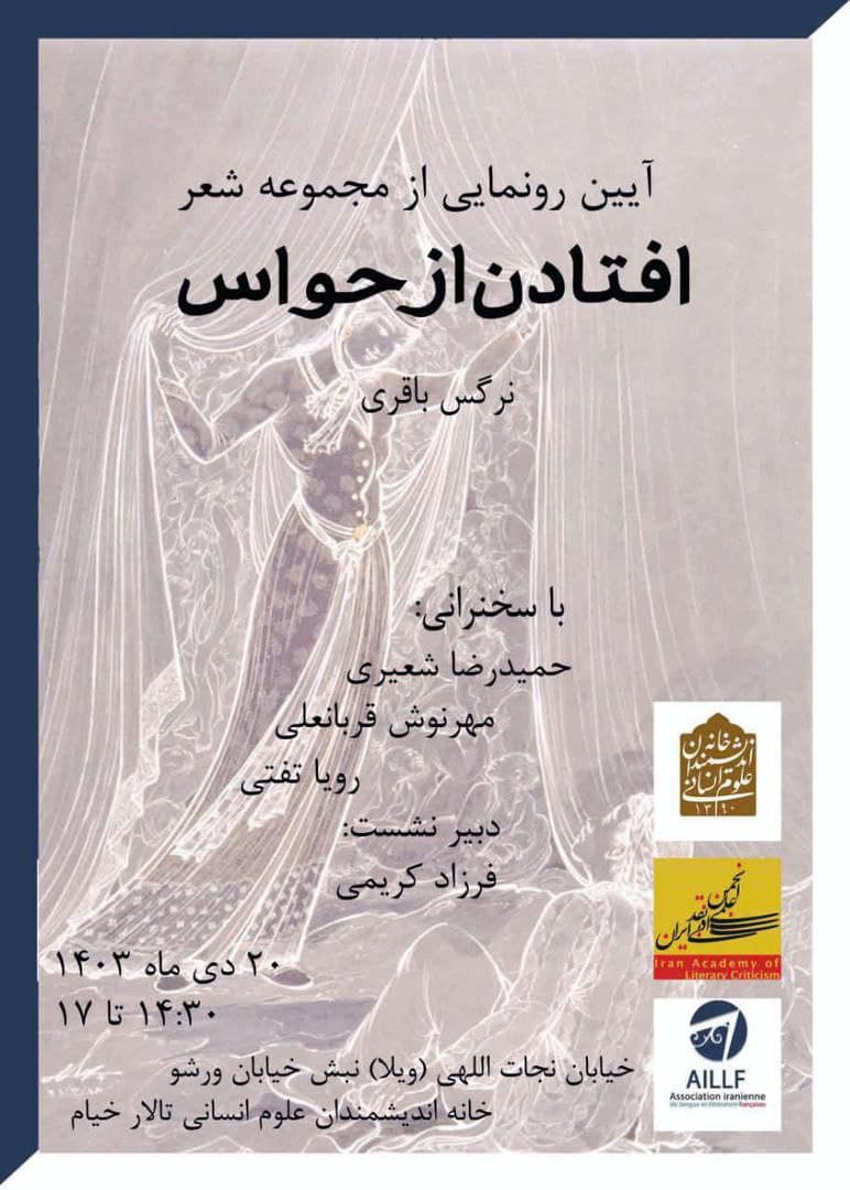 نشست " رونمایی از مجموعه شعر افتادن از حواس" روز پنج شنبه 20 دی در سالن خیام خانه اندیشمندان علوم انسانی برگزار می شود.