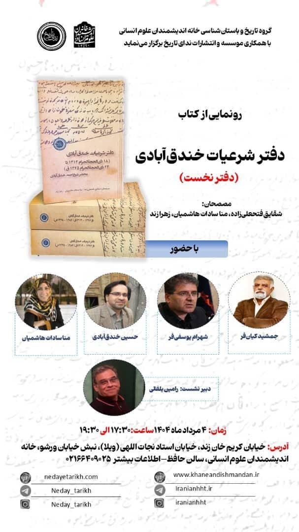به گزارش روابط عمومی خانه اندیشمندان علوم انسانی، نشست «رونمایی از کتاب دفتر شرعیات خندقآبادی» به همت گروه تاریخ و باستان شناسی خانه اندیشمندان علوم انسانی و با همکاری موسسه و انتشارات ندای تاریخ، روز شنبه 4 مرداد 1404 ساعت 17:30 در سالن حافظ خانه اندیشمندان علوم انسانی برگزار می شود.