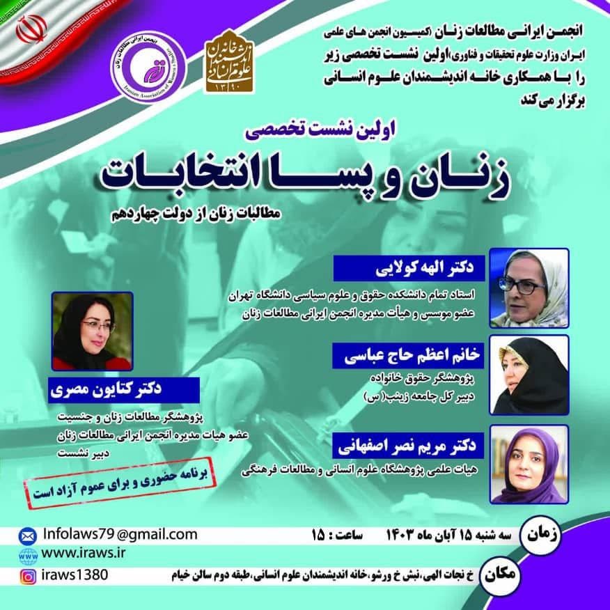 نشست "زنان و پسا انتخابات" روز سه شنبه 15 آبان در سالن خیام خانه اندیشمندان علوم انسانی برگزار می شود.