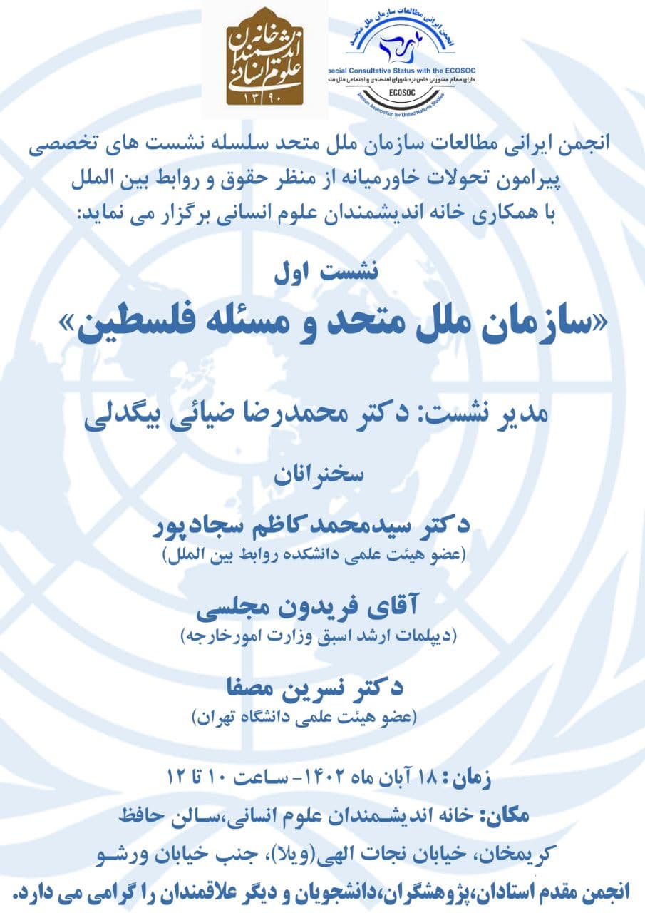 نشست "سازمان ملل متحد و فلسطین" روز پنج شنبه ۱۸ آبان در سالن حافظ خانه اندیشمندان علوم انسانی برگزار می شود.