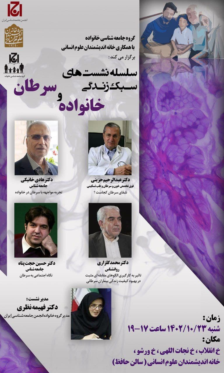 نشست "سبک زندگی؛ خانواده و سرطان" روز شنبه ۲۳ دی در سالن حافظ خانه اندیشمندان علوم انسانی برگزار می شود.