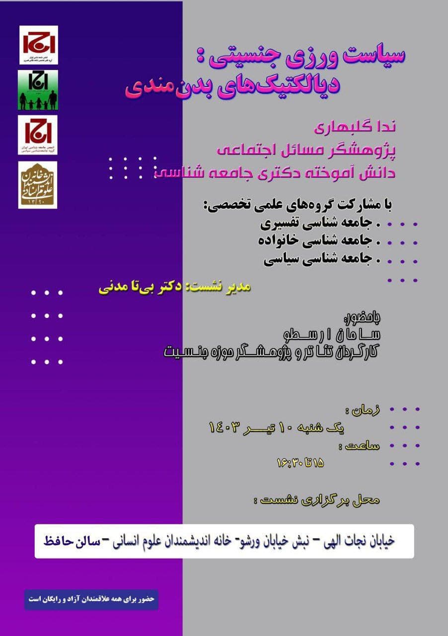 به گزارش روابط عمومی خانه اندیشمندان علوم انسانی، نشست "سیاست ورزی جنسیتی: دیالکتیک های بدن مندی" به همت انجمن جامعه شناسی ایران و با همکاری خانه اندیشمندان علوم انسانی، روز یکشنبه 10 تیر 1403 ساعت 15 در سالن حافظ خانه اندیشمندان علوم انسانی برگزار می شود.
