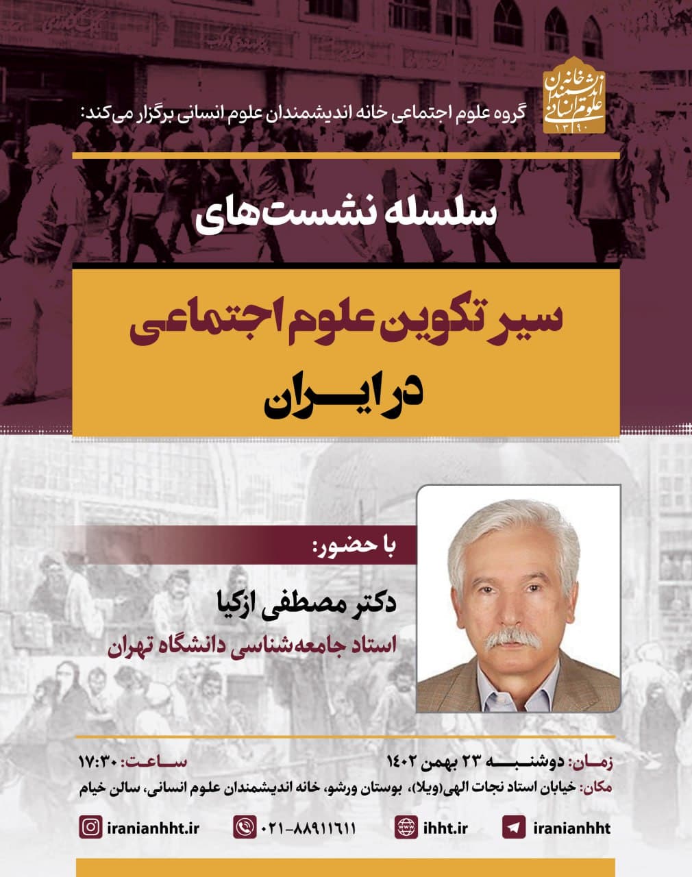 به گزارش روابط عمومی خانه اندیشمندان علوم انسانی، نشست "سیر تکوین در علوم اجتماعی در ایران" به همت گروه علوم اجتماعی خانه اندیشمندان علوم انسانی، روز دوشنبه ۲۳ بهمن ۱۴۰۲ ساعت ۱۷:۳۰ با حضور مصطفی ازکیا استاد جامعه شناسی دانشگاه تهران در سالن خیام خانه اندیشمندان علوم انسانی برگزار می شود.