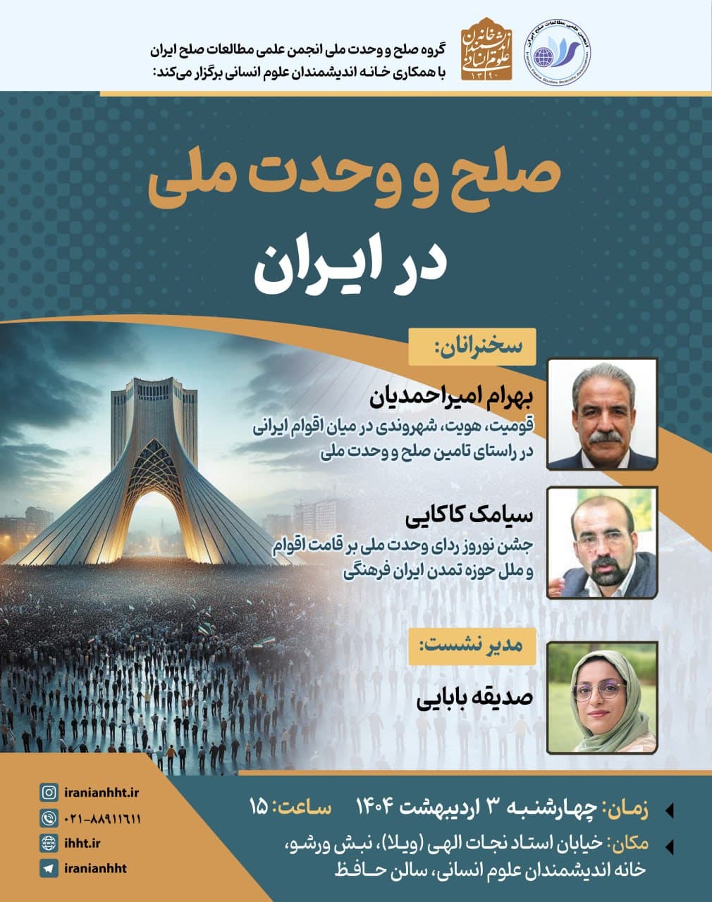 نشست "صلح و وحدت ملی در ایران" روز چهارشنبه 3 اردیبهشت در سالن حافظ خانه اندیشمندان علوم انسانی برگزار می شود.