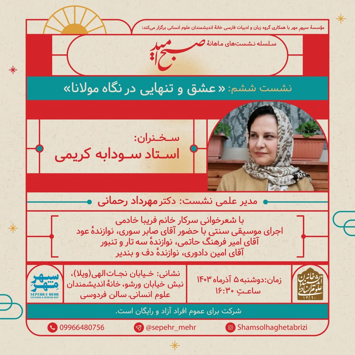 به گزارش روابط عمومی خانه اندیشمندان علوم انسانی، نشست "عشق و تنهایی در نگاه مولانا" به همت موسسه سپهر مهر و با همکاری گروه زبان و ادبیات فارسی خانه اندیشمندان علوم انسانی، روز دوشنبه 5 آذر 1403 ساعت 16:30 در سالن فردوسی خانه اندیشمندان علوم انسانی برگزار می شود.