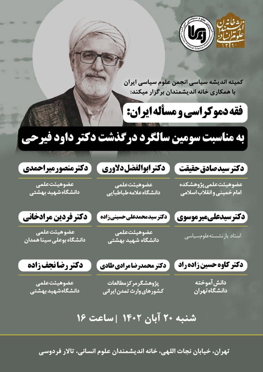 به گزارش روابط عمومی خانه اندیشمندان علوم انسانی، نشست "فقه دموکراسی و مسئله ایران" به مناسبت سومین سالگرد درگذشت داود فیرحی، به همت انجمن علوم سیاسی ایران و با همکاری خانه اندیشمندان علوم انسانی، روز شنبه ۲۰ آبان ۱۴۰۲ ساعت ۱۶ در سالن فردوسی خانه اندیشمندان علوم انسانی برگزار می شود.