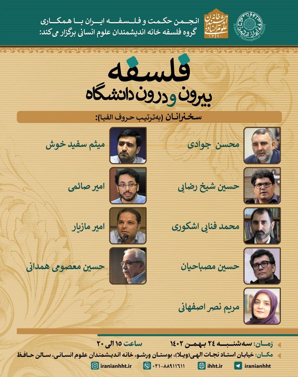 نشست "فلسفه؛ بیرون و درون دانشگاه" روز سه شنبه ۲۴ بهمن در سالن حافظ خانه اندیشمندان علوم انسانی برگزار می شود.