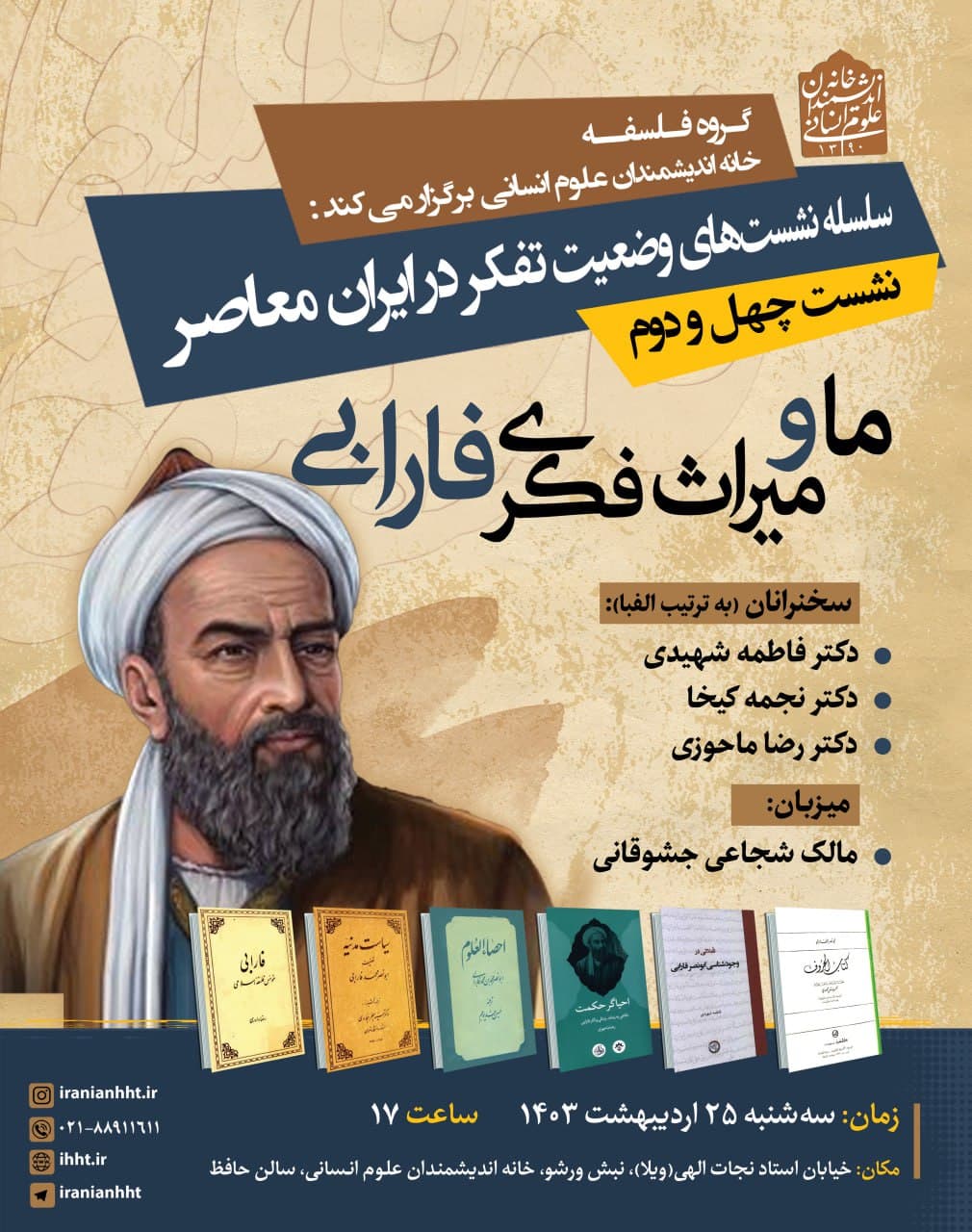 نشست "ما و میراث فکری فارابی" روز سه شنبه 25 اردیبهشت در سالن حافظ خانه اندیشمندان علوم انسانی برگزار می شود.