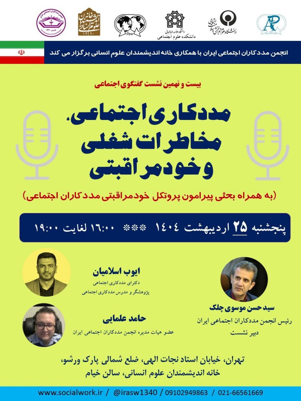نشست "مددکاری اجتماعی، مخاطرات شغلی و خودمراقبتی" روز پنج شنبه 25 اردیبهشت در سالن خیام خانه اندیشمندان علوم انسانی برگزار می شود.