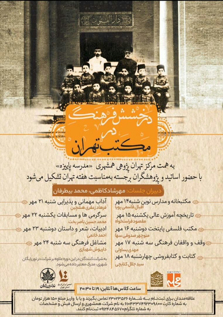 نشست "مدرسه پاییزه تهران؛ درخشش فرهنگ در مکتب تهران" از 14 مهر در بستر گوگل میت برگزار می شود.