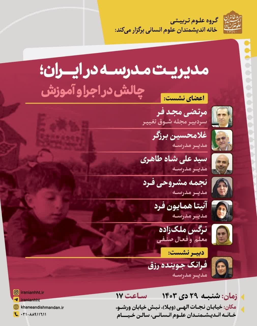 نشست "مدیریت مدرسه در ایران؛ چالش در اجرا و آموزش" روز شنبه 29 دی در سالن خیام خانه اندیشمندان علوم انسانی برگزار می شود.