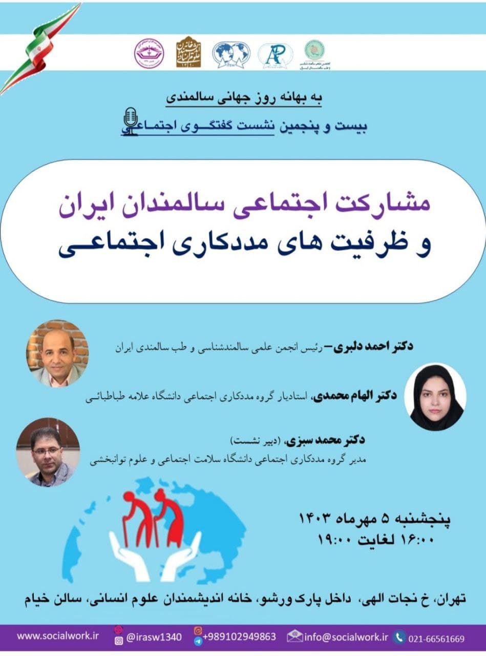 نشست "مشارکت اجتماعی سالمندان ایران و ظرفیت های مددکاری اجتماعی" روز پنج شنبه 5 مهر در سالن خیام خانه اندیشمندان علوم انسانی برگزار می شود.