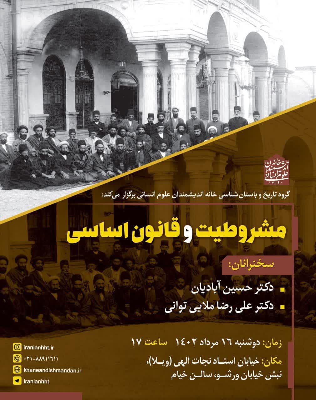 نشست مشروطیت و قانون اساسی، دوشنبه ۱۶ مرداد در سالن خیام خانه اندیشمندان علوم انسانی برگزار می شود.