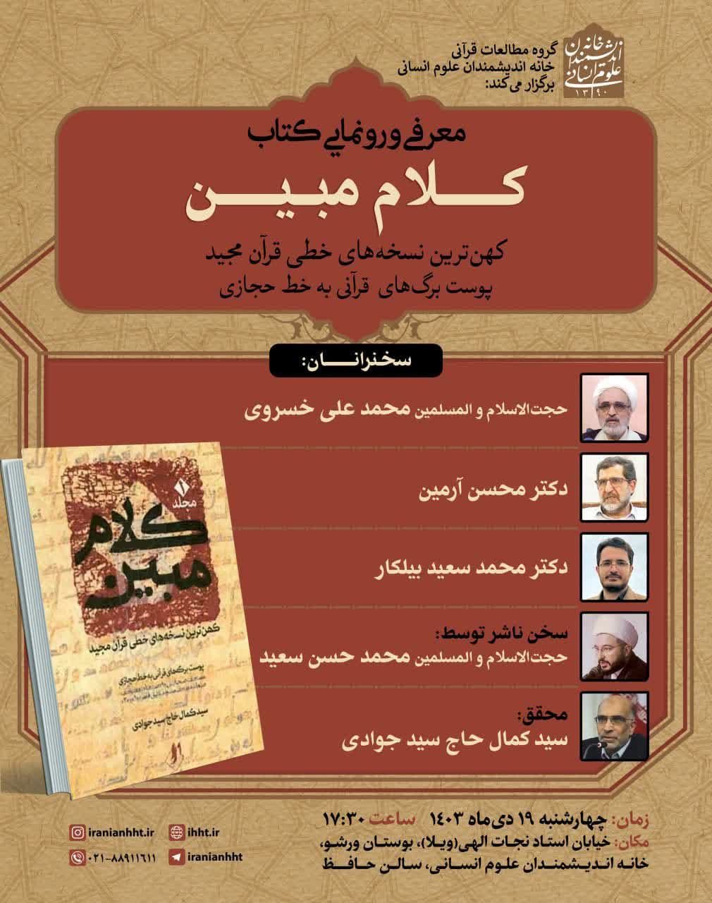 نشست "معرفی و رونمایی کتاب کلام مبین" روز چهارشنبه 19 دی در سالن حافظ خانه اندیشمندان علوم انسانی برگزار می شود.
