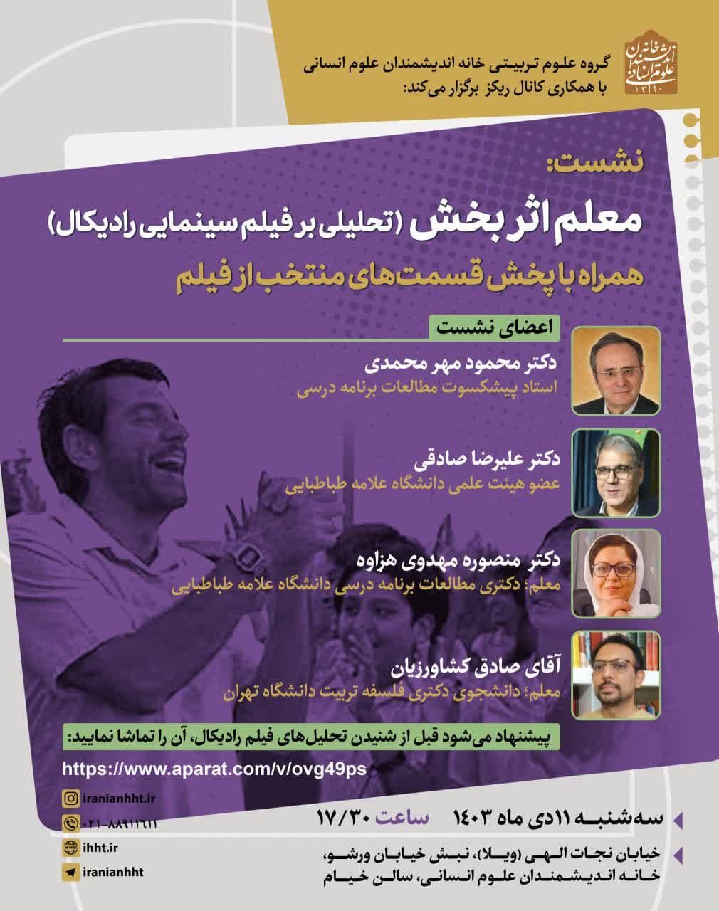 نشست "معلم اثر بخش؛ تحلیلی بر فیلم سینمایی رادیکال" روز سه شنبه 11 دی در سالن خیام خانه اندیشمندان علوم انسانی برگزار می شود.