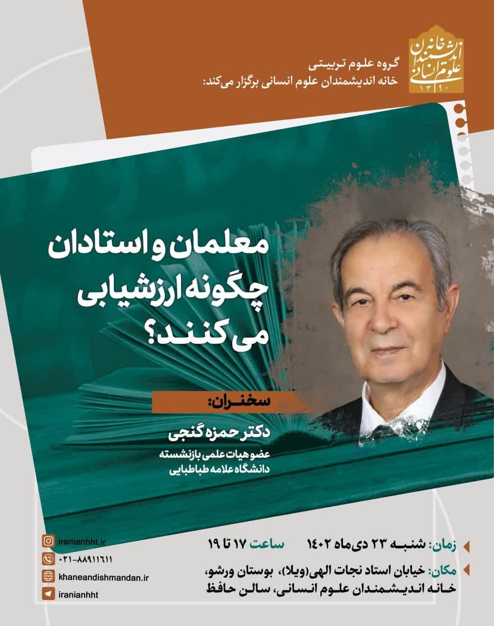 به گزارش روابط عمومی خانه اندیشمندان علوم انسانی، نشست "معلمان و استادان چگونه ارزشیابی می کنند؟" به همت گروه علوم تربیتی خانه اندیشمندان علوم انسانی، روز شنبه ۲۳ دی ۱۴۰۲ ساعت ۱۷ با حضور حمزه گنجی استاد بازنشسته دانشگاه علامه طباطبایی در سالن حافظ خانه اندیشمندان علوم انسانی برگزار می شود.