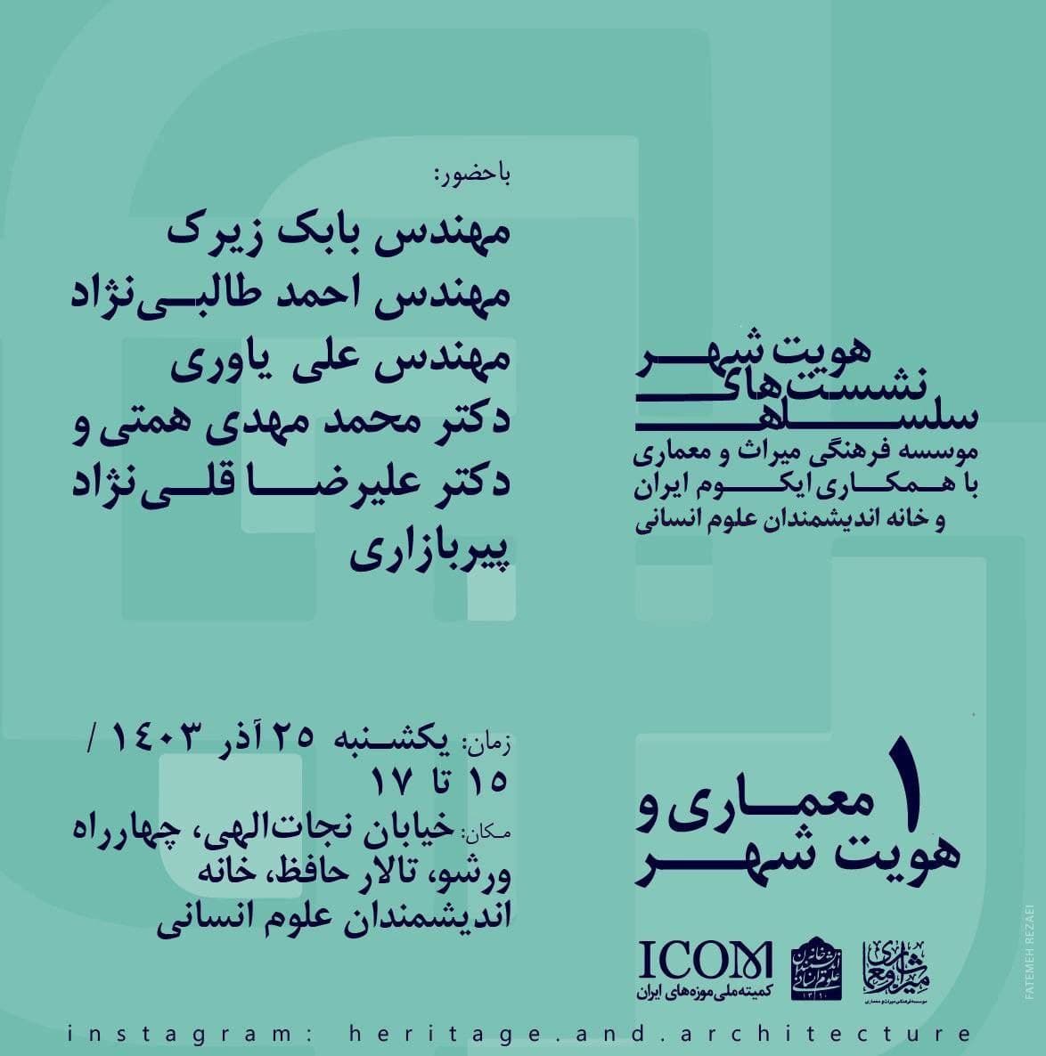 به گزارش روابط عمومی خانه اندیشمندان علوم انسانی، نشست "معماری و هویت شهر" به همت موسسه فرهنگ میراث و معماری، ایکوم اریان و با همکاری خانه اندیشمندان علوم انسانی، روز یکشنبه 25 آذر 1403 ساعت 15 در سالن حافظ خانه اندیشمندان علوم انسانی برگزار می شود.