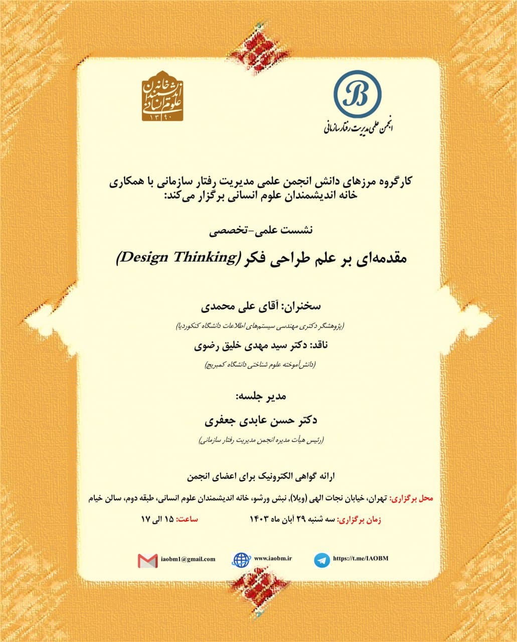 نشست "مقدمه ای بر علم طراحی فکر (Design Thinking)" روز سه شنبه 29 آبان در سالن خیام خانه اندیشمندان علوم انسانی برگزار می شود.
