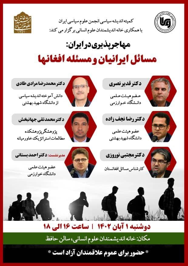 نشست "مهاجرپذیری در ایران: مسائل ایرانیان و مسئله افغانها" روز دوشنبه ۱ آبان در سالن حافظ خانه اندیشمندان علوم انسانی برگزار می شود.