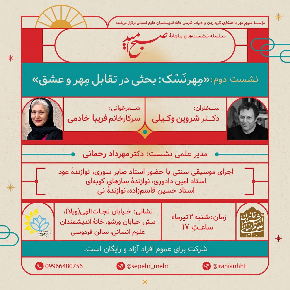 نشست "مهر نسک: بحثی در تقابل مهر و عشق" روز شنبه 2 تیر در سالن فردوسی خانه اندیشمندان علوم انسانی برگزار می شود.