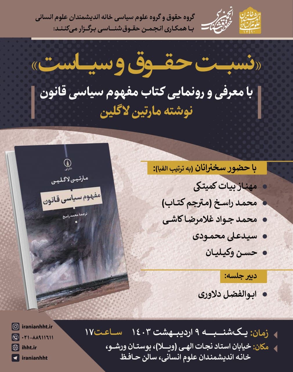 نشست "نسبت حقوق و سیاست" روز یکشنبه ۹ اردیبهشت در سالن حافظ خانه اندیشمندان علوم انسانی برگزار می شود.