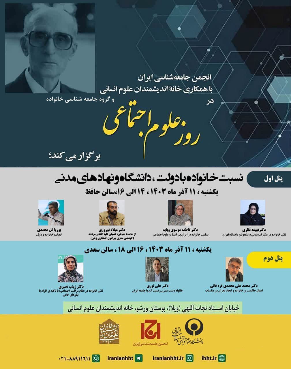 به گزارش روابط عمومی خانه اندیشمندان علوم انسانی، نشست "نسبت خانواده با دولت، دانشگاه و نهادهای مدنی" به همت انجمن جامعه شناسی ایران و با همکاری خانه اندیشمندان علوم انسانی، روز یکشنبه 11 آذر 1403 ساعت 14 در سالن حافظ خانه اندیشمندان علوم انسانی برگزار می شود.