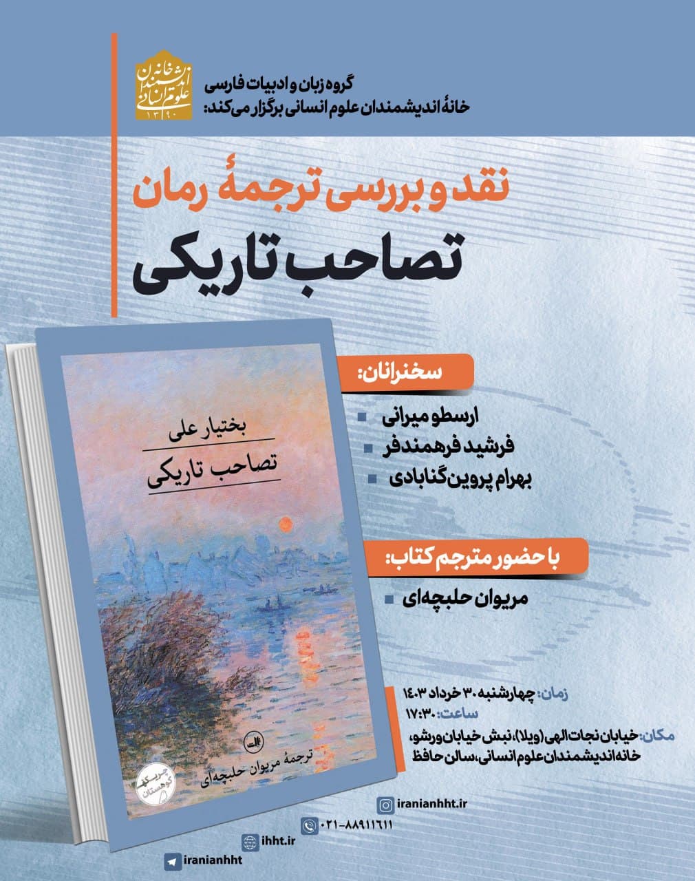 به گزارش روابط عمومی خانه اندیشمندان علوم انسانی، نشست "نقد و بررسی ترجمه رمان تصاحب تاریکی" به همت گروه زبان و ادبیات فارسی خانه اندیشمندان علوم انسانی، روز چهارشنبه 30 خرداد 1403 ساعت 17:30 در سالن حافظ خانه اندیشمندان علوم انسانی برگزار می شود.