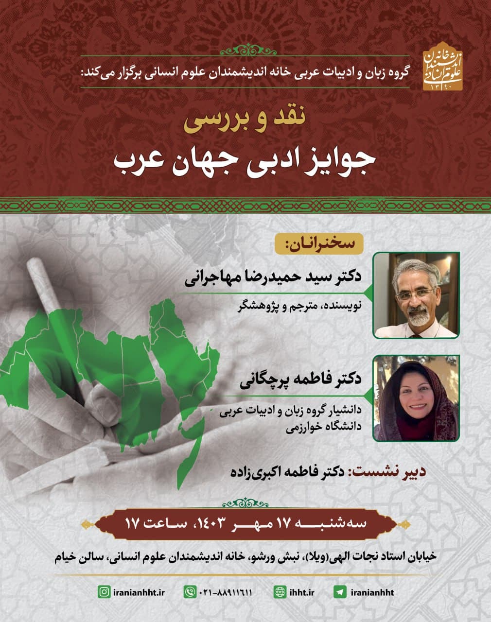 نشست "نقد و بررسی جوایز ادبی جهان عرب" روز سه شنبه 17 مهر در سالن خیام خانه اندیشمندان علوم انسانی برگزار می شود.
