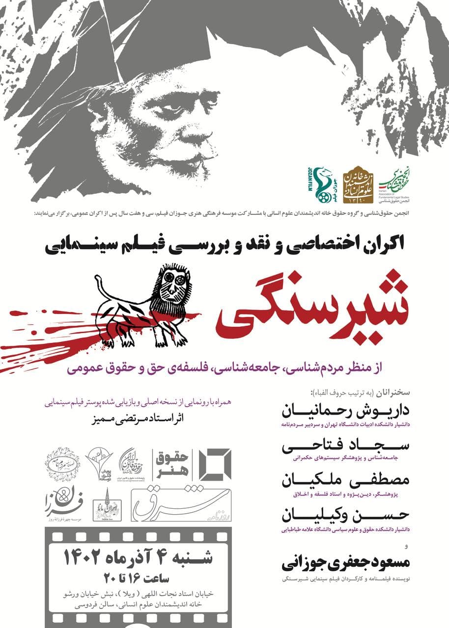 به گزارش روابط عمومی خانه اندیشمندان علوم انسانی، نشست نقد و بررسی فیلم "شیر سنگی" به همت انجمن حقوق شناسی و گروه حقوق خانه اندیشمندان علوم انسانی و با مشارکت موسسه فرهنگی هنری جوزان فیلم، روز شنبه ۴ آذر ۱۴۰۲ ساعت ۱۶ در سالن فردوسی خانه اندیشمندان علوم انسانی برگزار می شود.