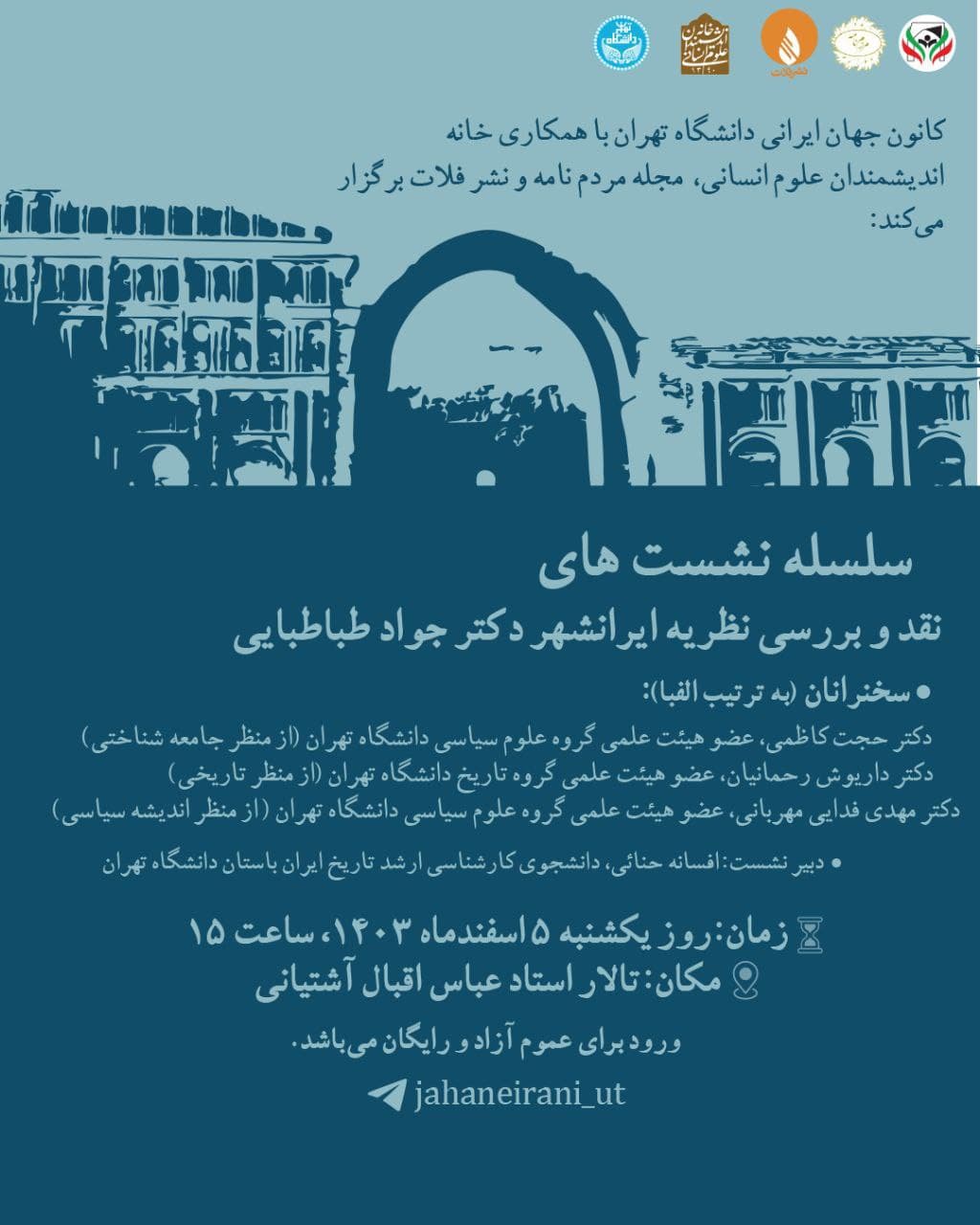 نشست "نقد و بررسی نظریه ایرانشهر دکتر جواد طباطبایی" روز یکشنبه 5 اسفند در تالار استاد عباس اقبال آشتیانی دانشگاه تهران برگزار می شود.