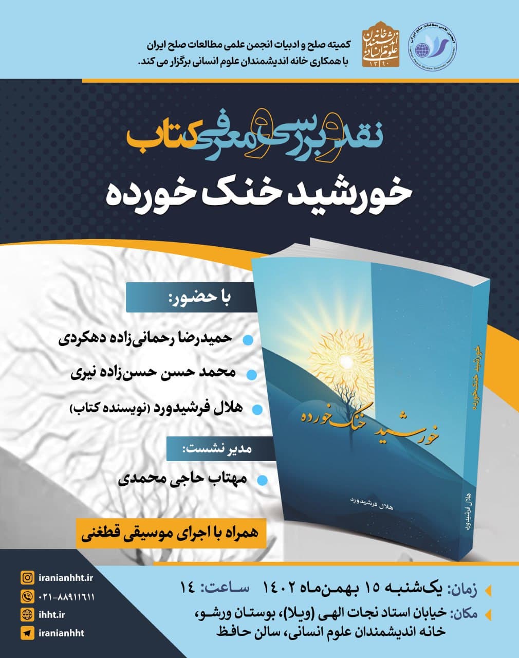 به گزارش روابط عمومی خانه اندیشمندان علوم انسانی، نشست "نقد و بررسی و معرفی کتاب خورشید خنک خورده" به همت انجمن مطالعات صلح ایران و با همکاری خانه اندیشمندان علوم انسانی، روز یکشنبه ۱۵ بهمن ۱۴۰۲ ساعت ۱۴ در سالن حافظ خانه اندیشمندان علوم انسانی برگزار می شود.