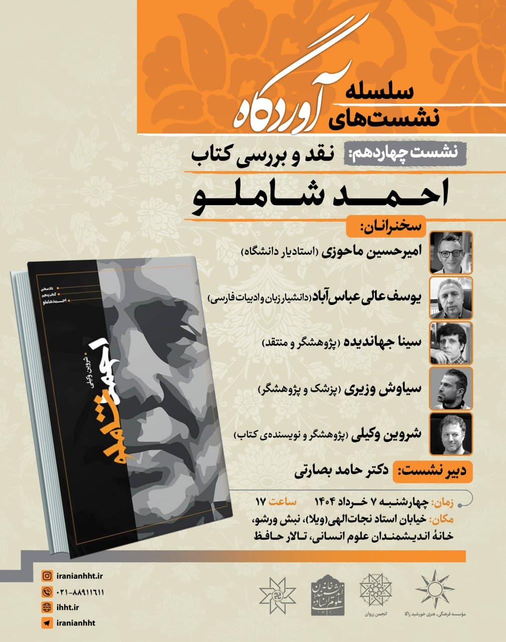 نشست "نقد و بررسی کتاب احمد شاملو" روز چهارشنبه 7 خرداد در سالن حافظ خانه اندیشمندان علوم انسانی برگزار می شود.