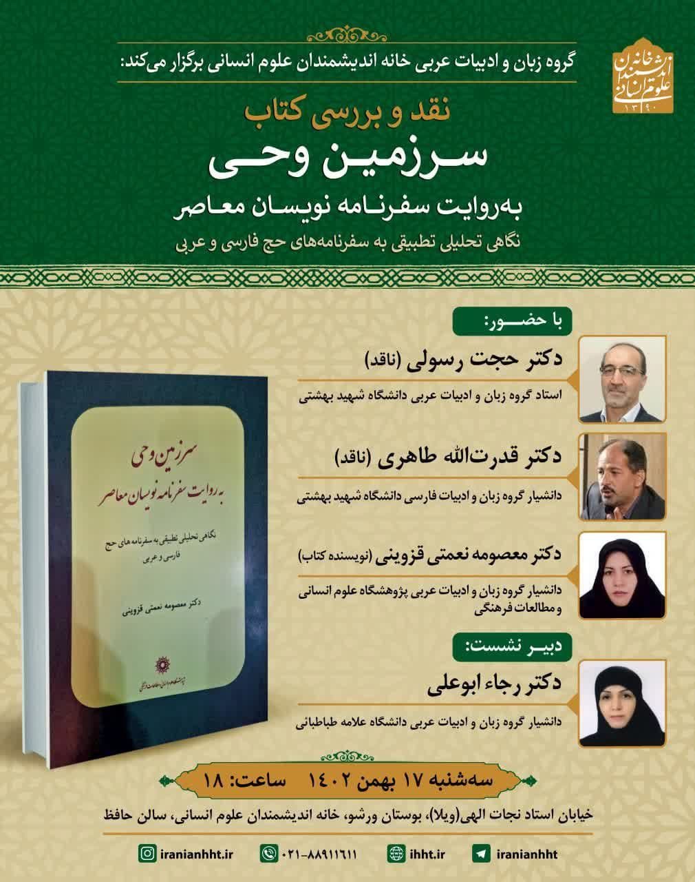 به گزارش روابط عمومی خانه اندیشمندان علوم انسانی، نشست "نقد و بررسی کتاب سرزمین وحی" به همت گروه زبان و ادبیات عربی خانه اندیشمندان علوم انسانی، روز سه شنبه ۱۷ بهمن ۱۴۰۲ ساعت ۱۸ در سالن حافظ خانه اندیشمندان علوم انسانی برگزار می شود.