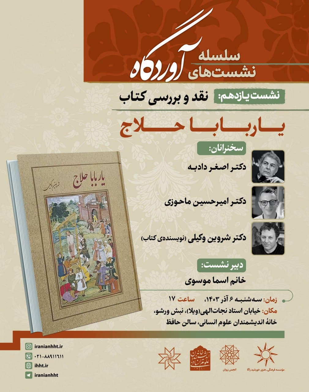 نشست "نقد و بررسی کتاب یاربابا حلاج" روز سه شنبه 6 آذر در سالن حافظ خانه اندیشمندان علوم انسانی برگزار می شود.