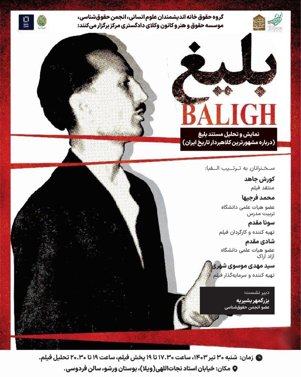 به گزارش روابط عمومی خانه اندیشمندان علوم انسانی، نشست "نمایش و تحلیل مستند بلیغ" به همت گروه حقوق خانه اندیشمندان علوم انسانی، انجمن حقوق شناسی، موسسه حقوق و هنر و کانون وکلای دادگستری، روز شنبه 30 تیر 1403 ساعت 17:30 در سالن فردوسی خانه اندیشمندان علوم انسانی برگزار می شود.