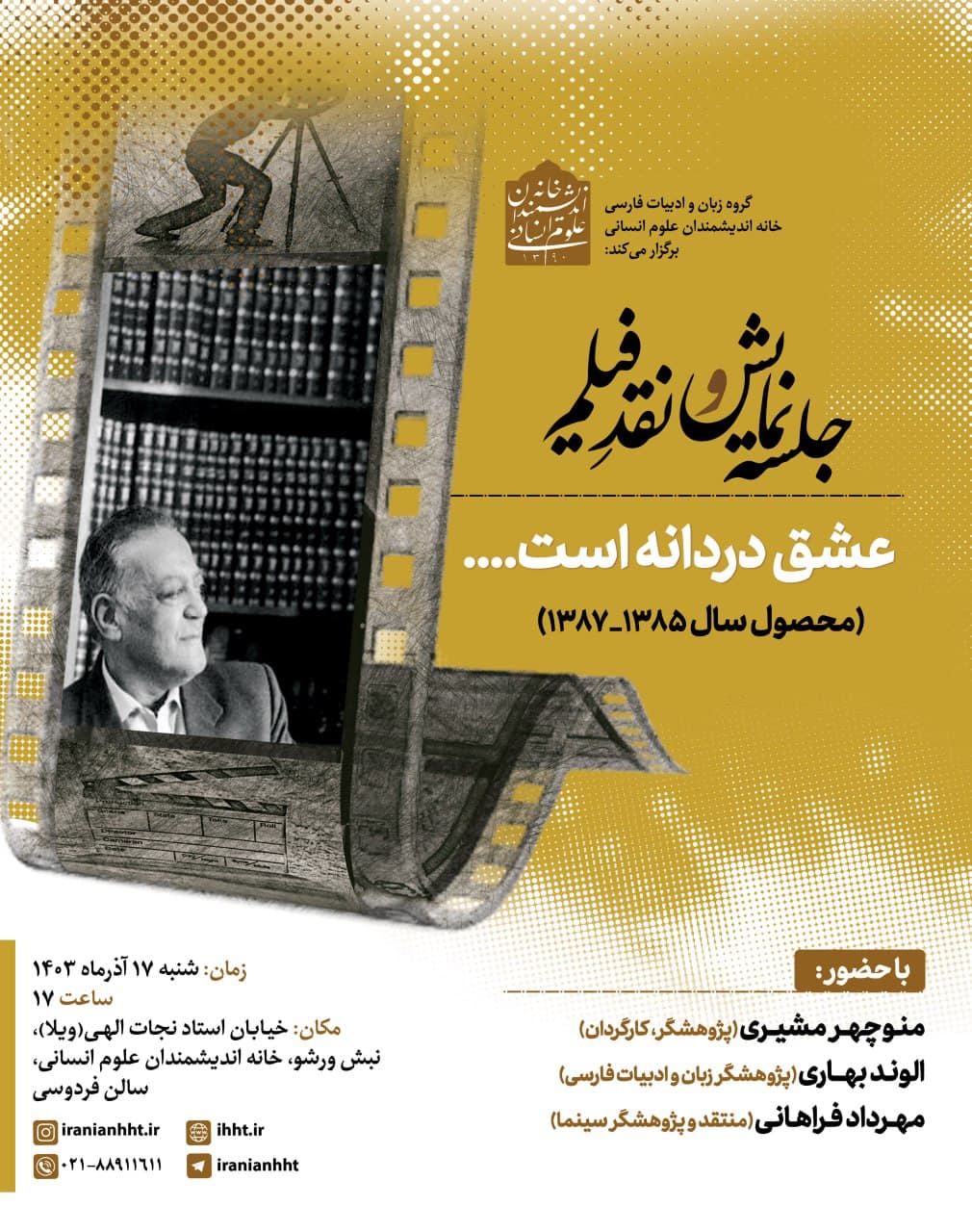 نشست "نمایش و نقد فیلم؛ عشق دردانه است..." روز شنبه 17 آذر در سالن فردوسی خانه اندیشمندان علوم انسانی برگزار می شود.