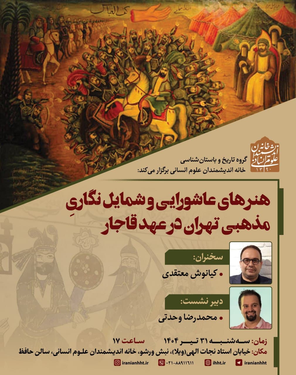 نشست "هنرهای عاشورایی و شمایل نگاری مذهبی تهران در عهد قاجار" روز سه شنبه 31 تیر در سالن حافظ خانه اندیشمندان علوم انسانی برگزار می شود.