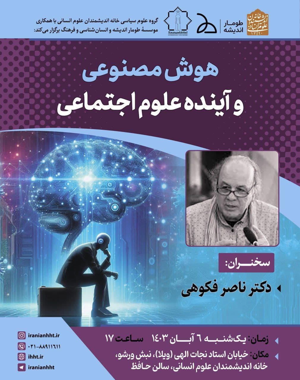 نشست "هوش مصنوعی و آینده علوم اجتماعی" روز یکشنبه 6 آبان در سالن حافظ خانه اندیشمندان علوم انسانی برگزار می شود.