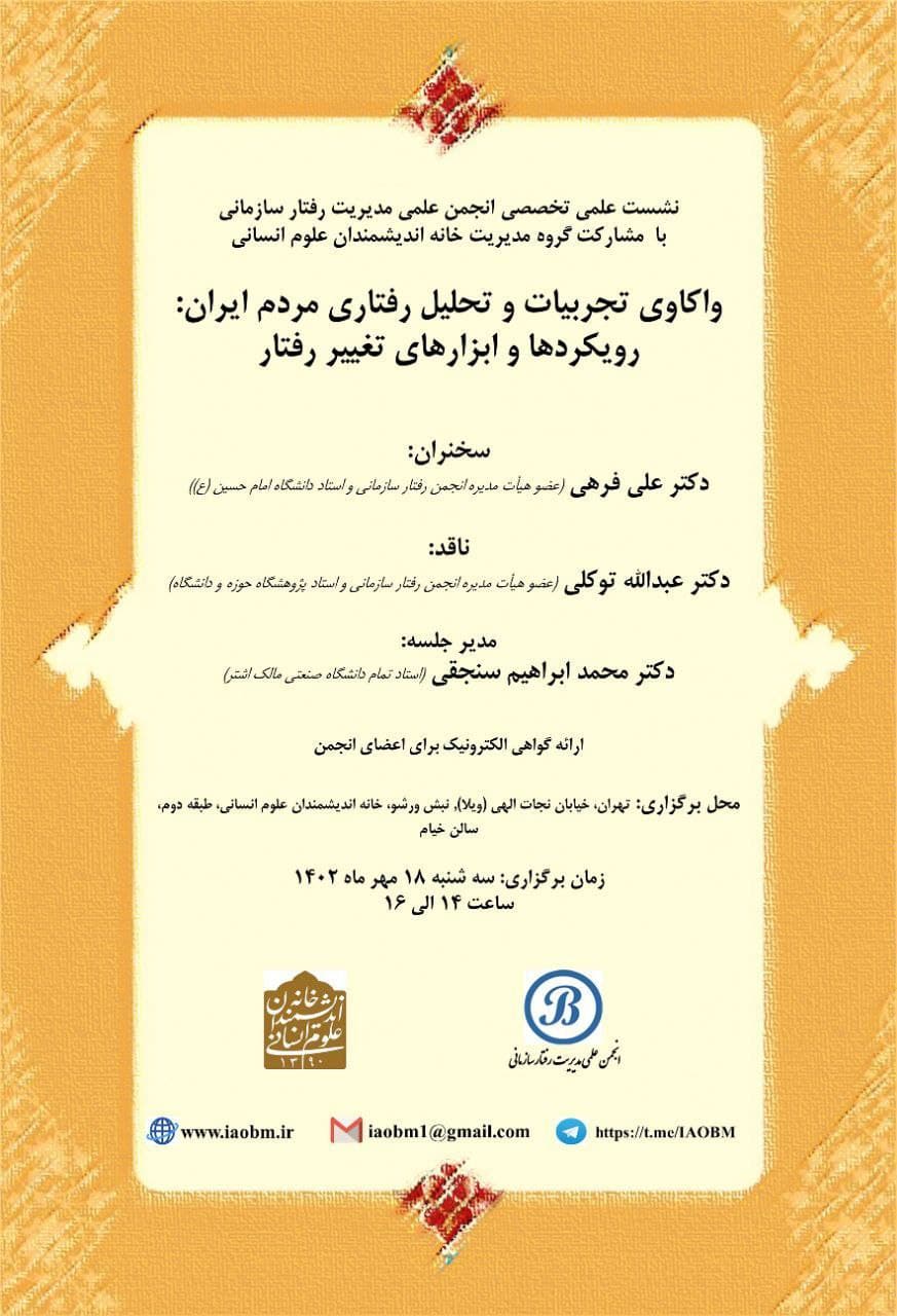 به گزارش روابط عمومی خانه اندیشمندان علوم انسانی، نشست "واکاوی تجربیات و تحلیل رفتاری مردم ایران" به همت انجمن علمی مدیریت رفتار سازمانی و با همکاری گروه مدیریت خانه اندیشمندان علوم انسانی، روز سه شنبه ۱۸ مهر ۱۴۰۲ ساعت ۱۴ الی ۱۶ در سالن خیام خانه اندیشمندان علوم انسانی برگزار می شود.