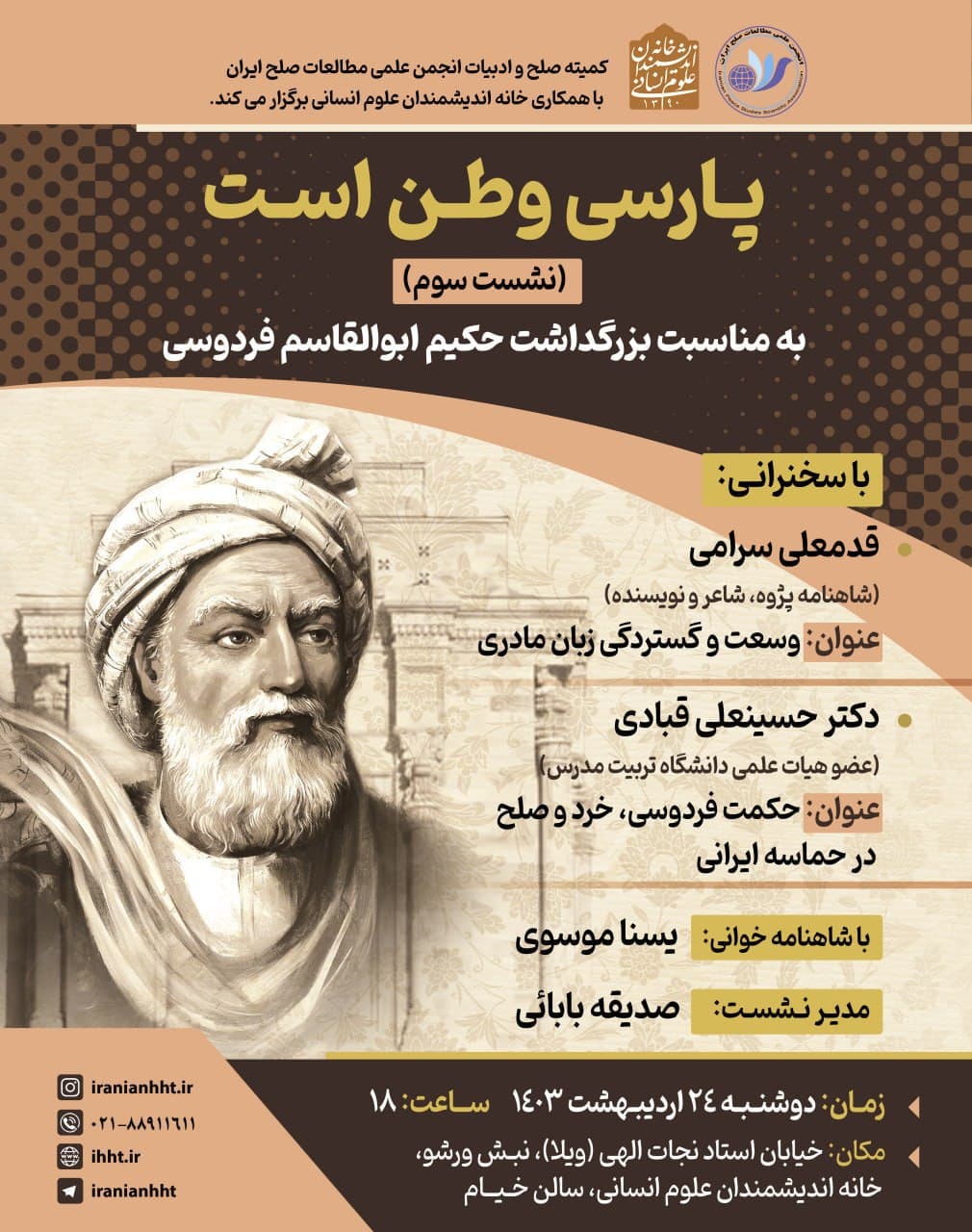 به گزارش روابط عمومی خانه اندیشمندان علوم انسانی، نشست "پارسی وطن است" به همت انجمن مطالعات صلح ایران و با همکاری خانه اندیشمندان علوم انسانی، روز دوشنبه 24 اردیبهشت 1403 ساعت 18 در سالن خیام خانه اندیشمندان علوم انسانی برگزار می شود.
