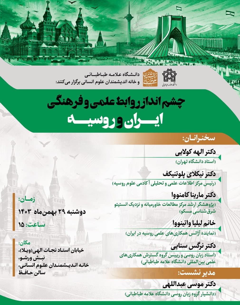 نشست "چشم انداز روابط علمی و فرهنگی ایران و روسیه" روز دوشنبه 29 بهمن در سالن حافظ خانه اندیشمندان علوم انسانی برگزار می شود.